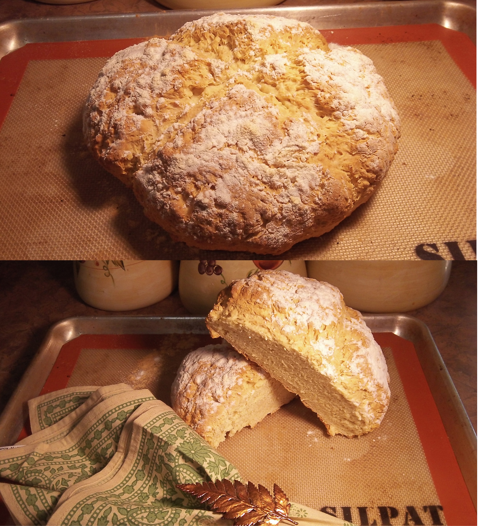 **The cross on the soda bread has several explanations. Legend has it that folks did it to “let the devil out” while it’s baking for good luck, and others say that it made it easy to divide into 4 pieces. It was also a symbol for a cross during Christian holidays. ***
