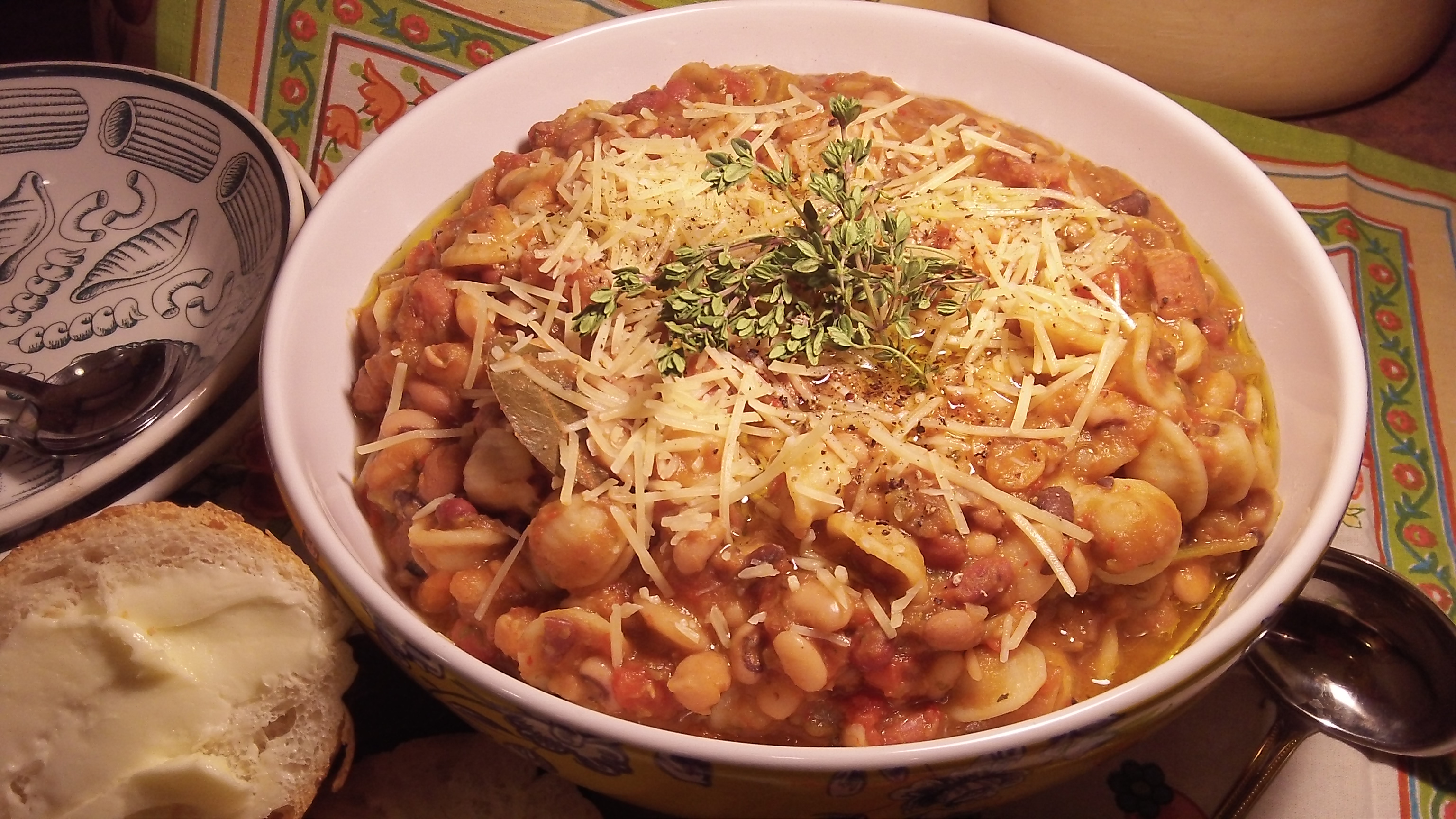 Pasta e Fagioli, meaning “pasta and beans” is a traditional northern Italian “stick to your ribs” stew-like bean and pasta soup. Like many other Italian favorites, it started as a peasant dish, being composed of inexpensive ingredients such as bacon, beans and garden vegetables. Serve with a fresh, crisp salad and crusty Italian of French bread