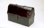 Historic lunchboxes from the 1880s. In the center photo you can see a tobacco box recycled as a lunch box. Around the 1880s, school children, who wanted to try to be like their daddies, fashioned similar boxes out of empty cookie or tobacco tins. According to the timeline, the first commercial lunch boxes, similar to the center photo, resembled metal picnic baskets decorated with scenes of playing children, came out in 1902.