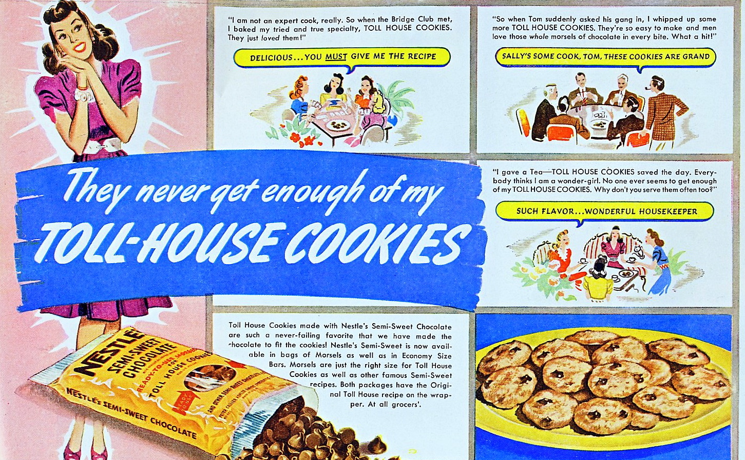 What do Toll House and Ruth Wakefield have in common? They were both formally introduced to Nestle for one. Ruth, wife, mother, former dietitian, author, baker and tourist lodge owner, made a boo boo in Whitman, Massachusetts on a cold winter’s day in her kitchen at the “Toll House Inn” in 1937—so she’s the first one to blame for your immense cravings and late night snack attacks!