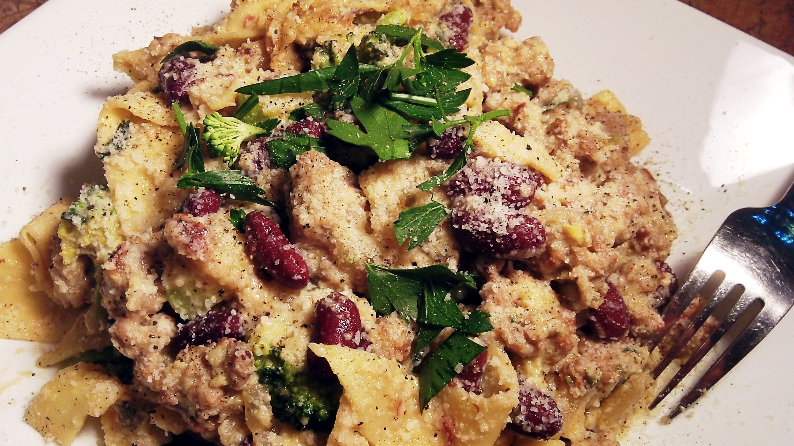 Add chicken broth, water and 1 teaspoon of salt to the mixture. Bring to a full boil and add uncooked pasta. Turn heat to low and simmer according to package directions, stirring occasionally. Add broccoli, kidney beans and capers. Simmer a few more minutes and add a little more water if you prefer your pasta less al dente. As the liquid reduces in the skillet, a small amount of sauce will form.