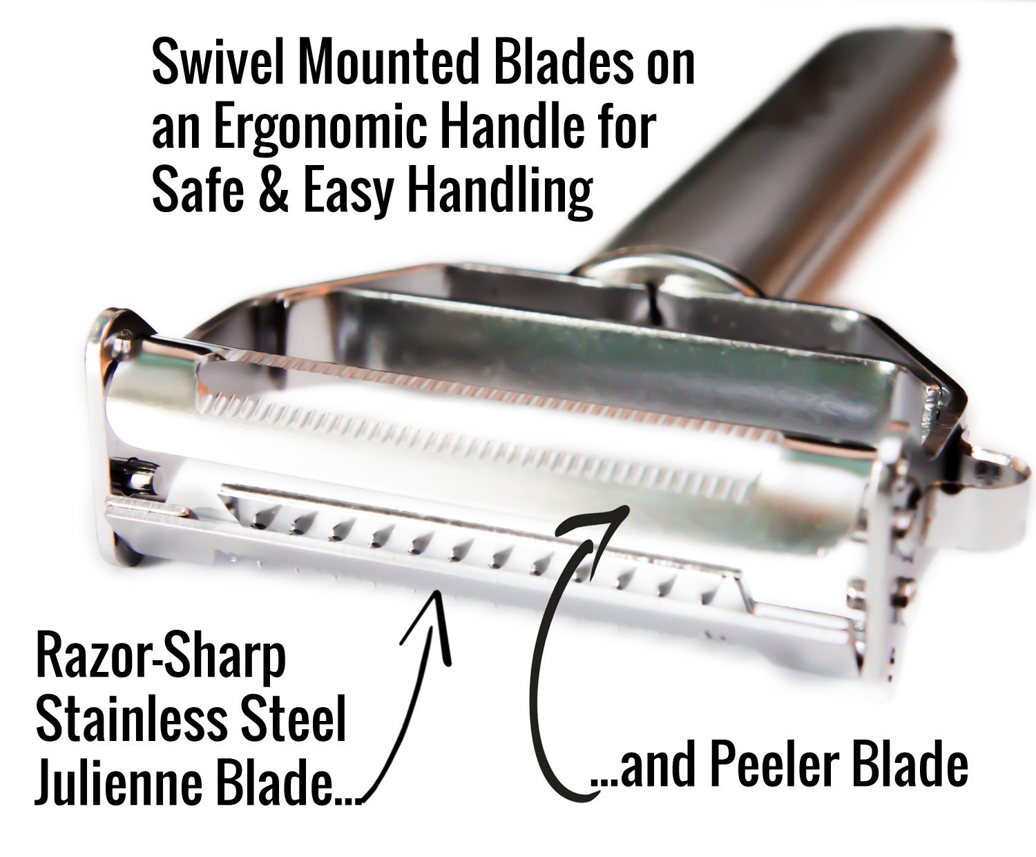 So, I got tired of gouging my fingers along with my veggies while peeling and commenced the search for a premium more ergonomic friendly gadget. I happened upon this ingenious device that seems to be holding up much longer than the norm as well. PLUS, it juliennes like a charm—such pretty, impressive garnishes this doodad makes! All for $9.95—yes, you read correctly!