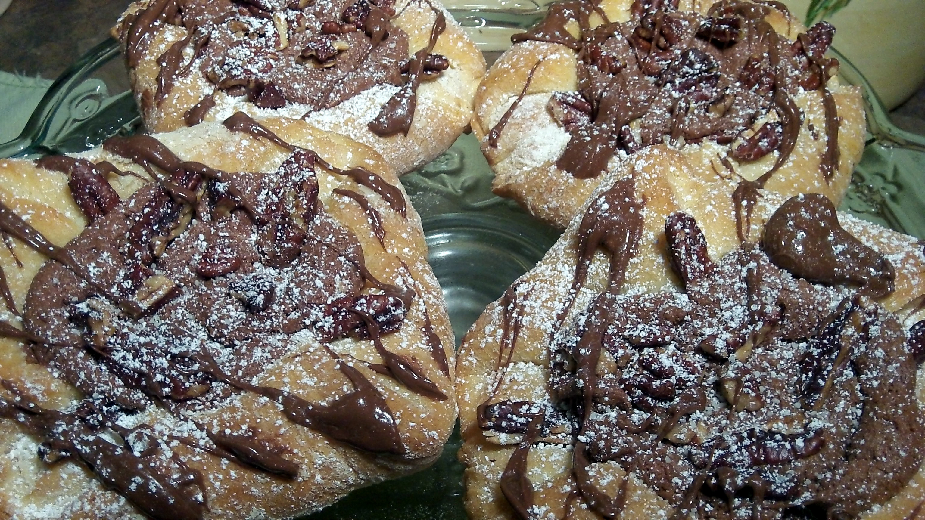 Whip mascarpone, powdered sugar, cinnamon. orange peel and 3 tbsp of Nutella with a mixer. Roll out crescent rolls into four squares, fold corners of each square into center and press. Fill centers with Nutella mix, sprinkle with pecans. Bake in preheated 375* oven for 12-15 minutes. Cool on wire rack for 10 minutes. Drizzle with a bit of melted Nutella and a sprinkling of powdered sugar. Makes 4 large Danish.