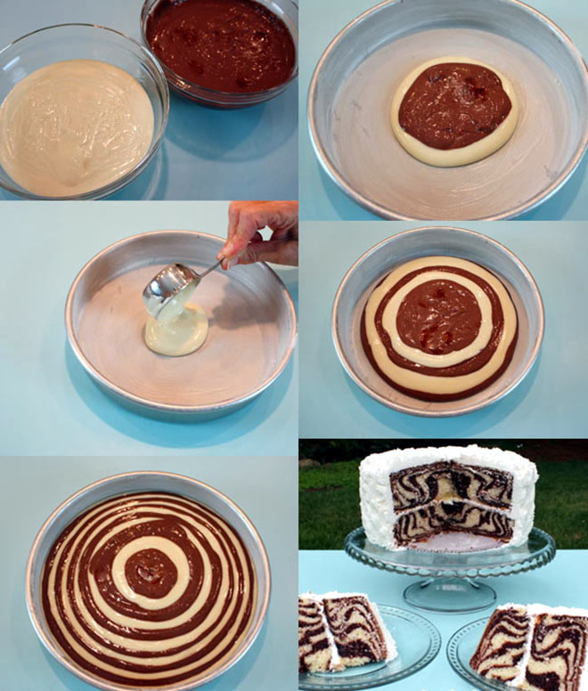 “The Zebra Cake” Two flavors of cake mixes, chocolate & vanilla. Why not add bright pink food color to the vanilla? Fun? Yes!! This is a “scoop of chocolate & scoop of vanilla” literally! Start with 1/2 C vanilla in the middle, allow to spread a bit, on top add a 1/2 C scoop of chocolate…repeat! Don’t mix batter just allow to spread until pan is 2/3 full. Bake, Cool & Frost! Genius!“The Chocolate Art Bowl” Hints: Use cooler, but melted chocolate or BOOM! Layer layer layer! Fill with COOL foods 🙂