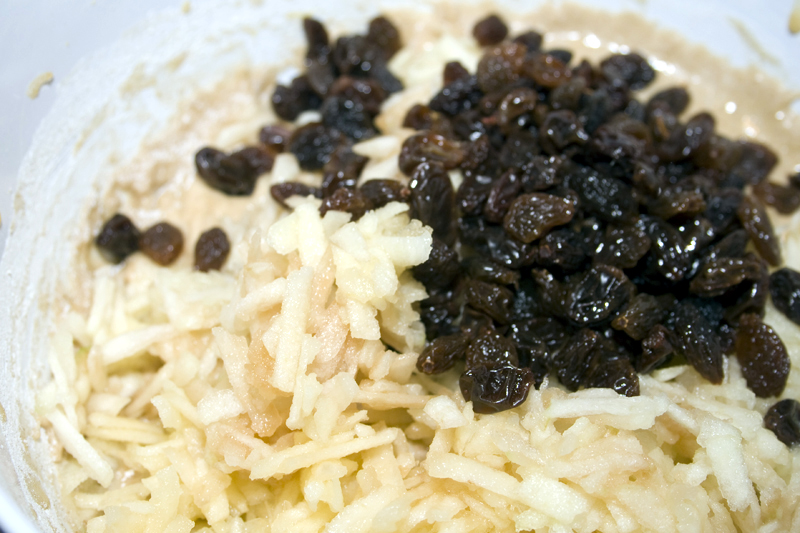 Simmer raisins in water until 1 cup liquid remains, about 20-25 minutes Add butter to raisins and water stir until melted, add chopped apples and spices. Set aside to cool. Beat egg and sugar together. Blend in remaining dry ingredients. Fold in raisin/apple mixture. Spread in greased 10×15 cookie sheet with edges. Bake at 350 degrees for 25-30 min. Frost or drizzle with powdered sugar glaze while still warm. Cut into squares.