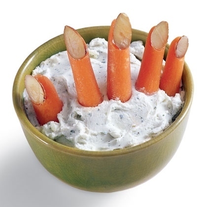 “Carrot Fingers” Place mini carrots in your favorite dip. Attach sliced almonds to tops with cream cheese. photo source: chicanolRoll biscuit dough into finger forms, carve out knuckles & fingertip with toothpick. Bake until golden. Attach sliced almonds with ketchup.