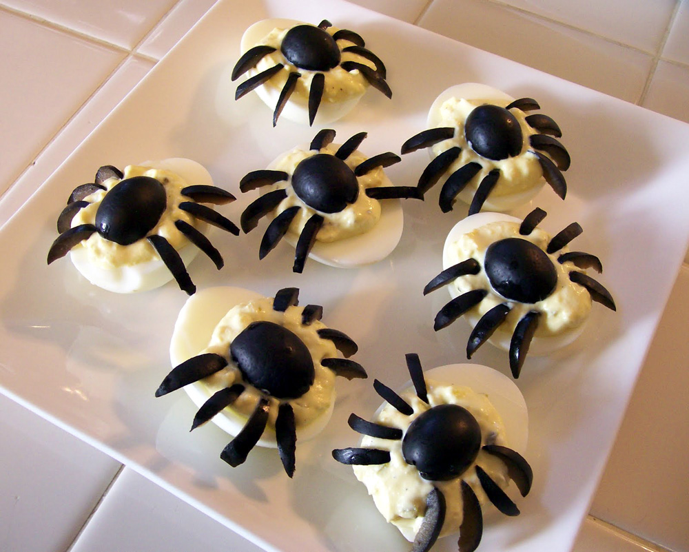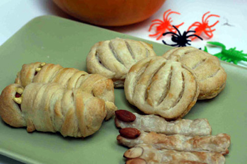 Eyeball Pizza: Top with shredded mozzarella, add circles of chopped green and black olives, scatter slivers of red peppers…bake. photo source: hungryhalloween“Deviled Spider Eggs” Cut black or green olives in halve followed by slices for legs. photo source:theworldaccordingtoeggface“Mini Mummy Pizzas” Start with English muffin halves add slices of mozzarella over sauce & pepperoni & sliced olives for eyes. photo source:pocketrangerMummy Dogs, Fingers and Pumpkins. Wrap slices of puff pastry around dogs, bake & add dots of mustard for eyes. Fingers, slices of pastry for almonds as nails. Pumpkins, use a cookie cutter for shapes and fill with your favorite savory or sweet cream cheese spread for the filling.