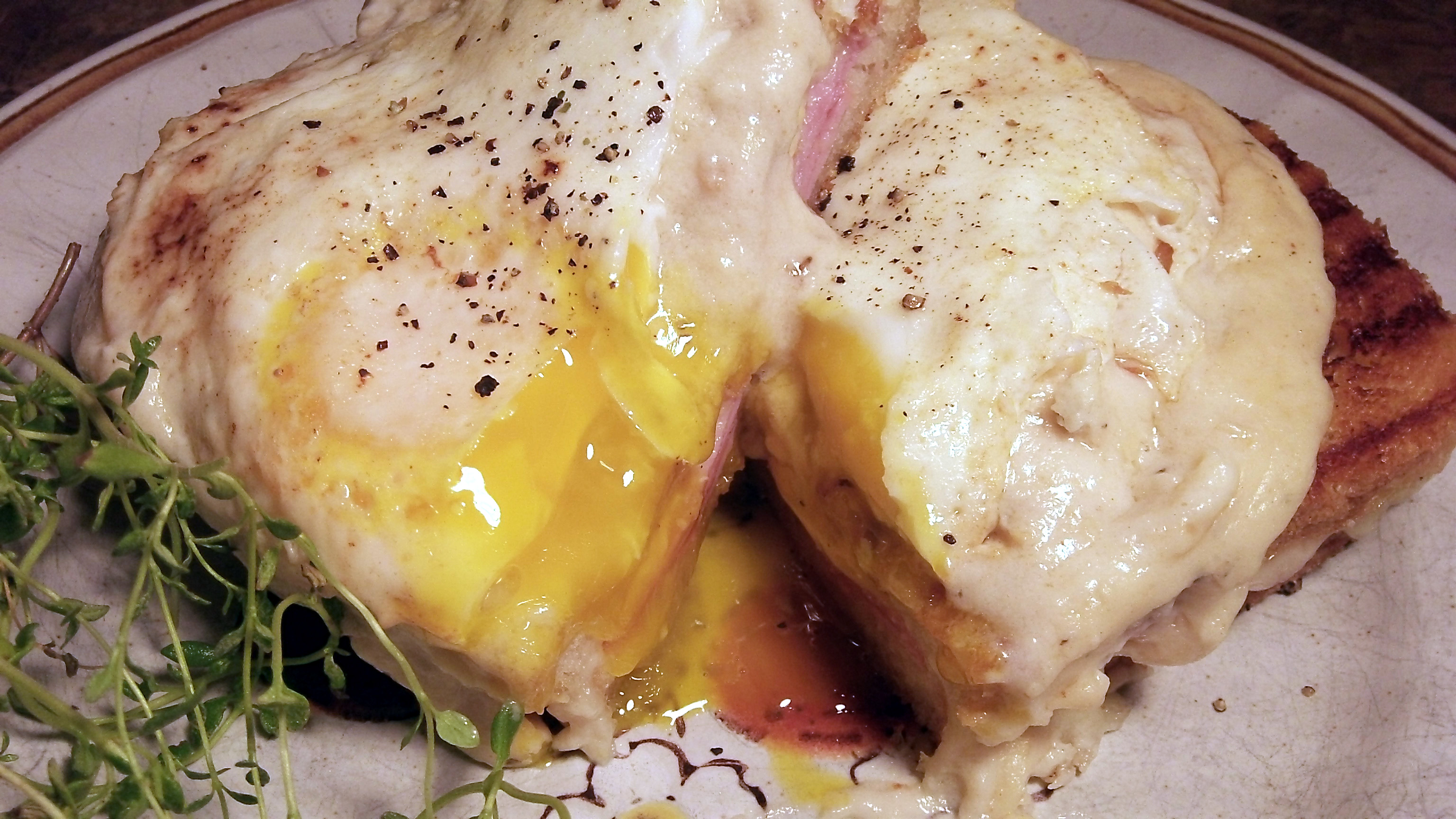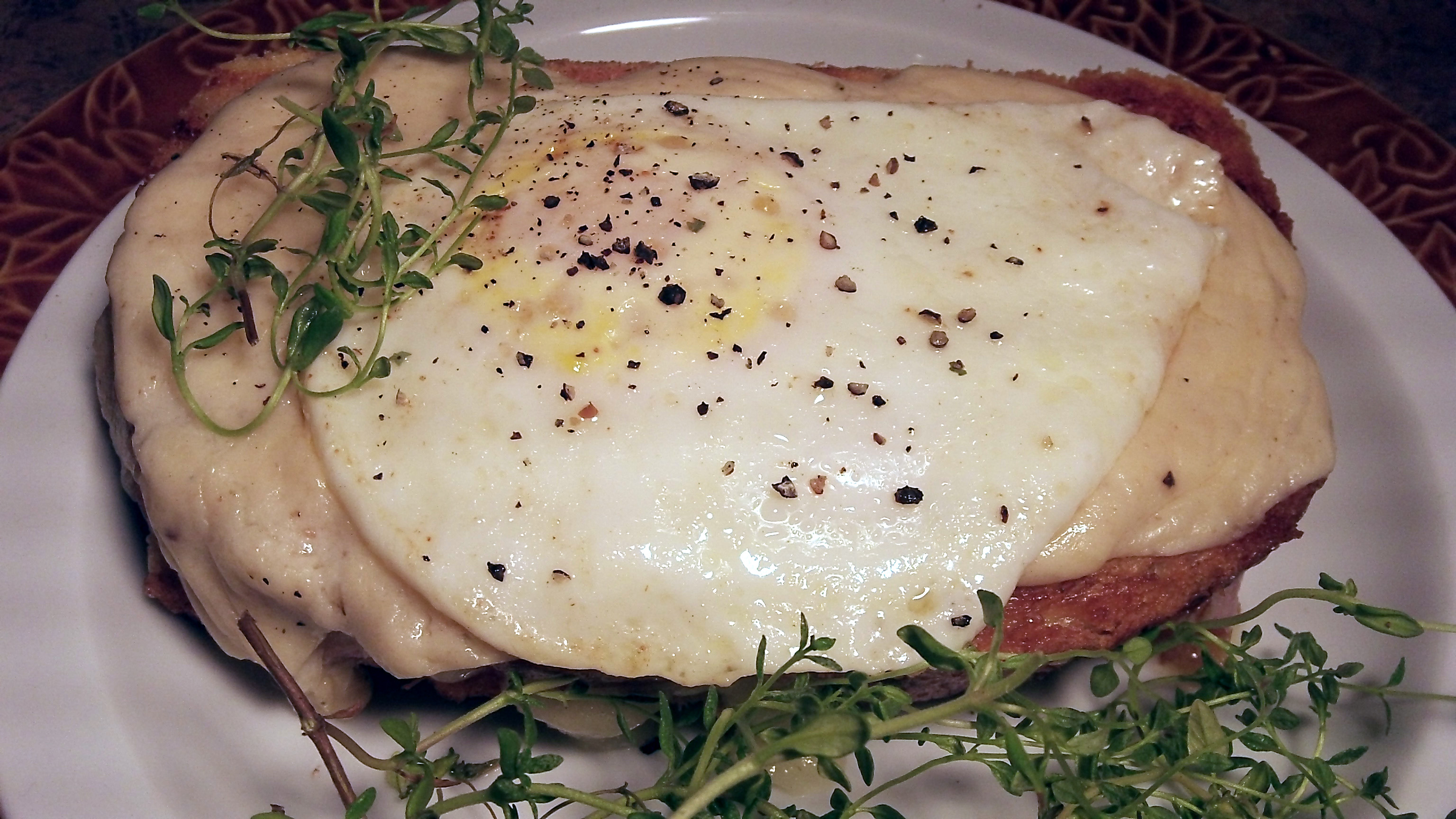 Preheat broiler. Place 2 bread slices on work surface. Spread each half with Dijon, ham and sliced Gruyère. Top with remaining bread. Heat heavy large skillet over low heat. Brush sandwiches with 1 tablespoon melted butter. Add to skillet and cook until deep golden brown, about 2 minutes per side. I use a Panini press. Transfer to small baking sheet. Spoon sauce, then grated cheese over sandwiches. Broil until cheese begins to brown, about 2-3 minutes. Top with fried egg and chives. I used fresh thyme for the photos.