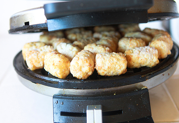 Scatter and fill hot waffle iron with frozen potato tots. No oil needed for the iron—allow the tots to do the work. Press the waffle lid over the top of your spuds. After about a minute, open the waffle iron to see how the hash browns are cooking. If you need to fill in any spaces add a few more tots to the bare spots. You’ll know your waffles are done when they are golden brown and crispy. Carefully place waffle onto a large plate. Allow to cool slightly before slicing into individual hash browns for your portable breakfast to go.