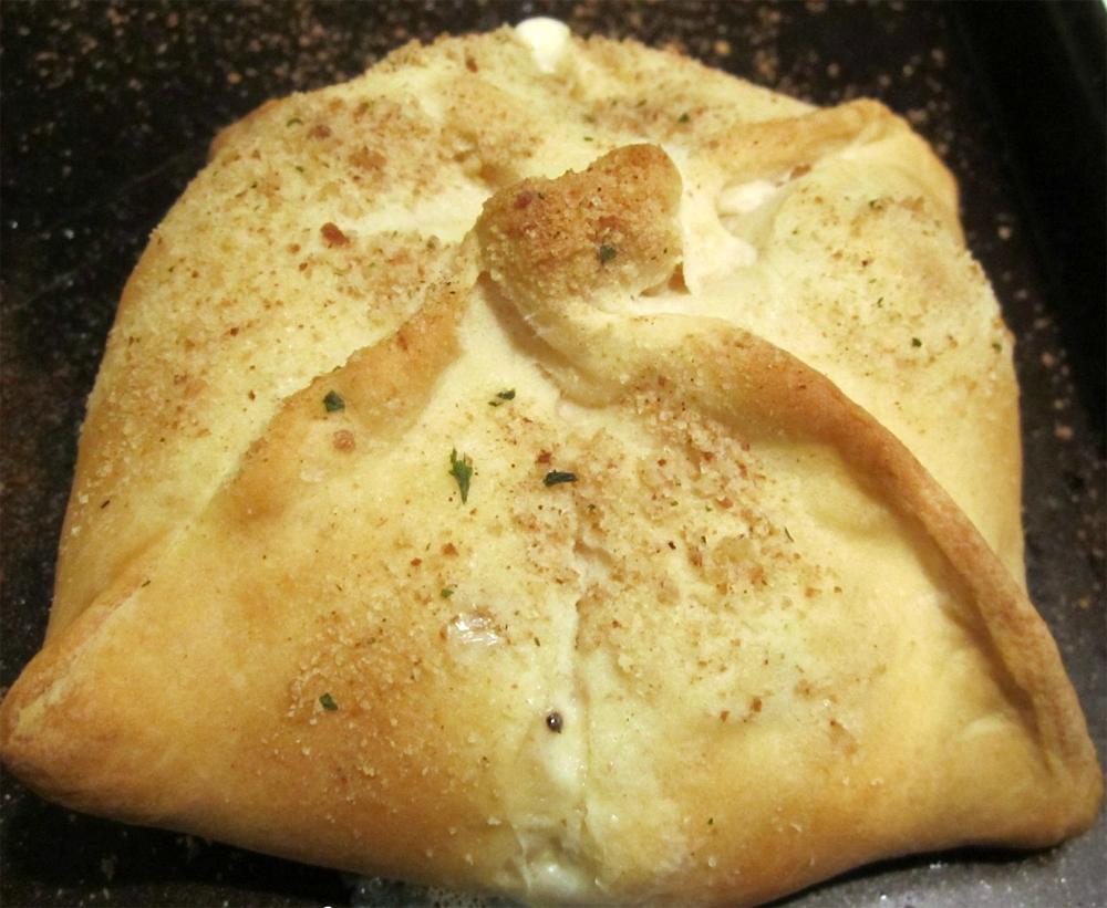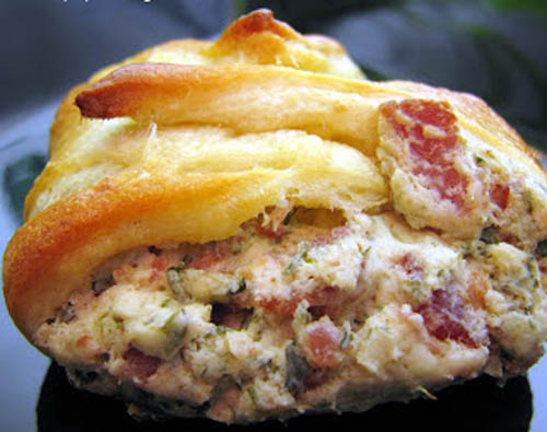 - Unroll crescent dough and separate into four rectangles; seal perforations. Transfer to a foil-lined baking sheet. Place 3 tablespoons mixture in the center of each rectangle. Bring four corners of dough over filling and twist; pinch to seal.