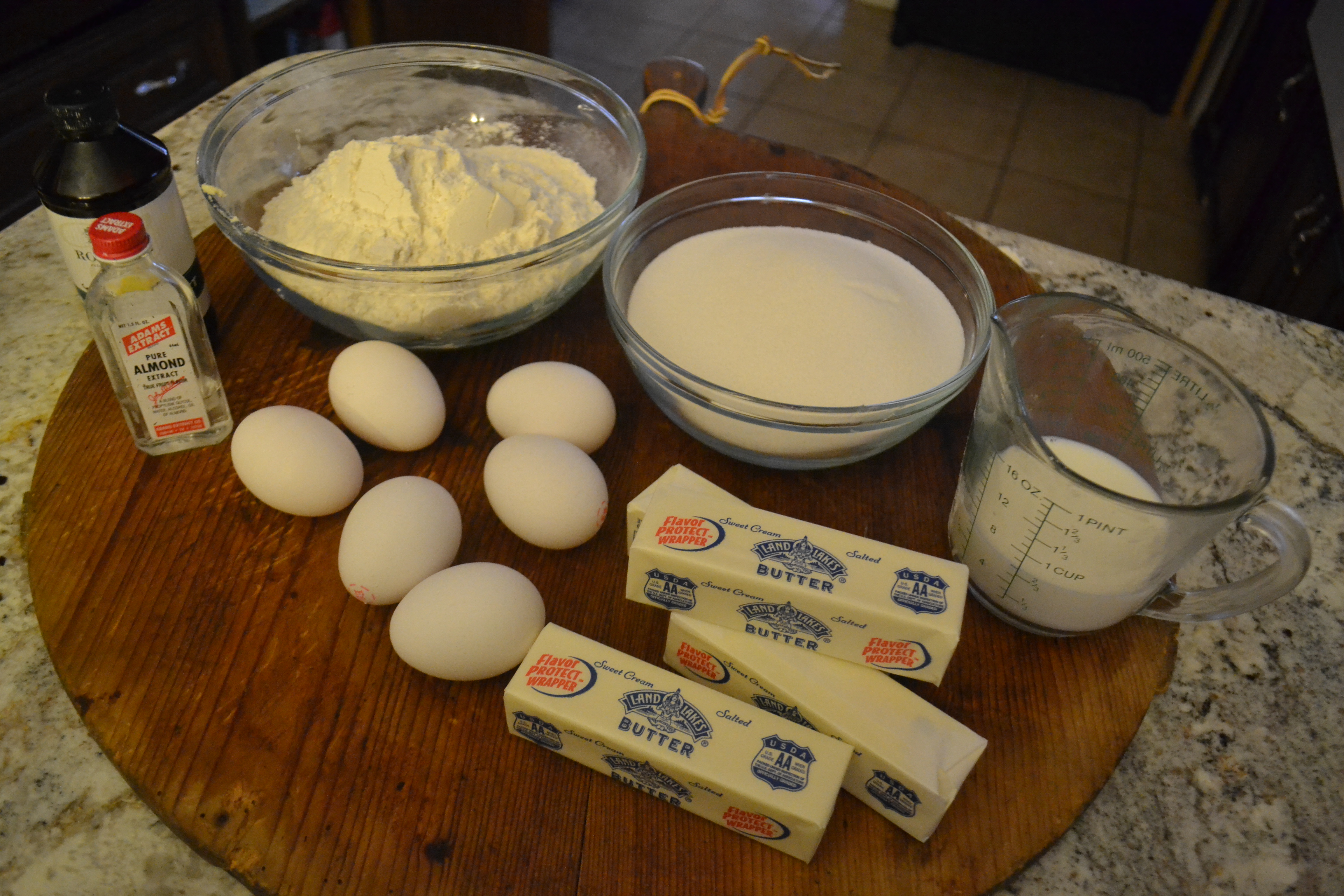 Grease and flour tube (or bundt) pan and set out eggs and butter to allow them to come to room temperature.