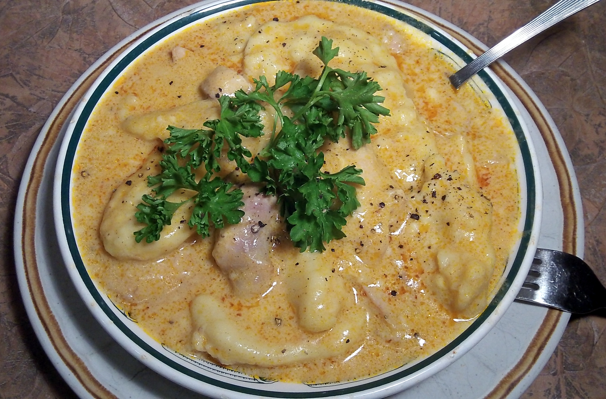Place chicken back into pot. Mix dumpling ingredients and drop large tablespoons of mixture into sauce, one at a time. Simmer an additional 7-10. Spoon into bowls and garnish with chopped parsley and fresh cracked pepper.