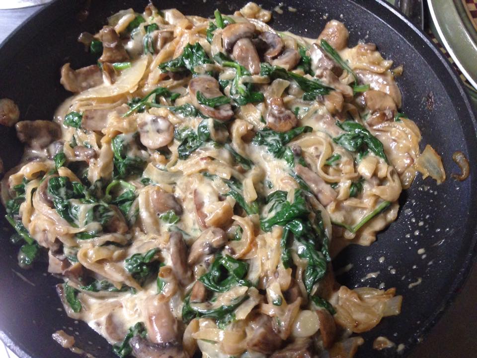 Add cooked mushrooms to the pan with caramelized onions, add 3 cups of spinach and stir on low heat just until spinach wilts. Serve as is as a side dish or proceed to make a creamy sauce as below.