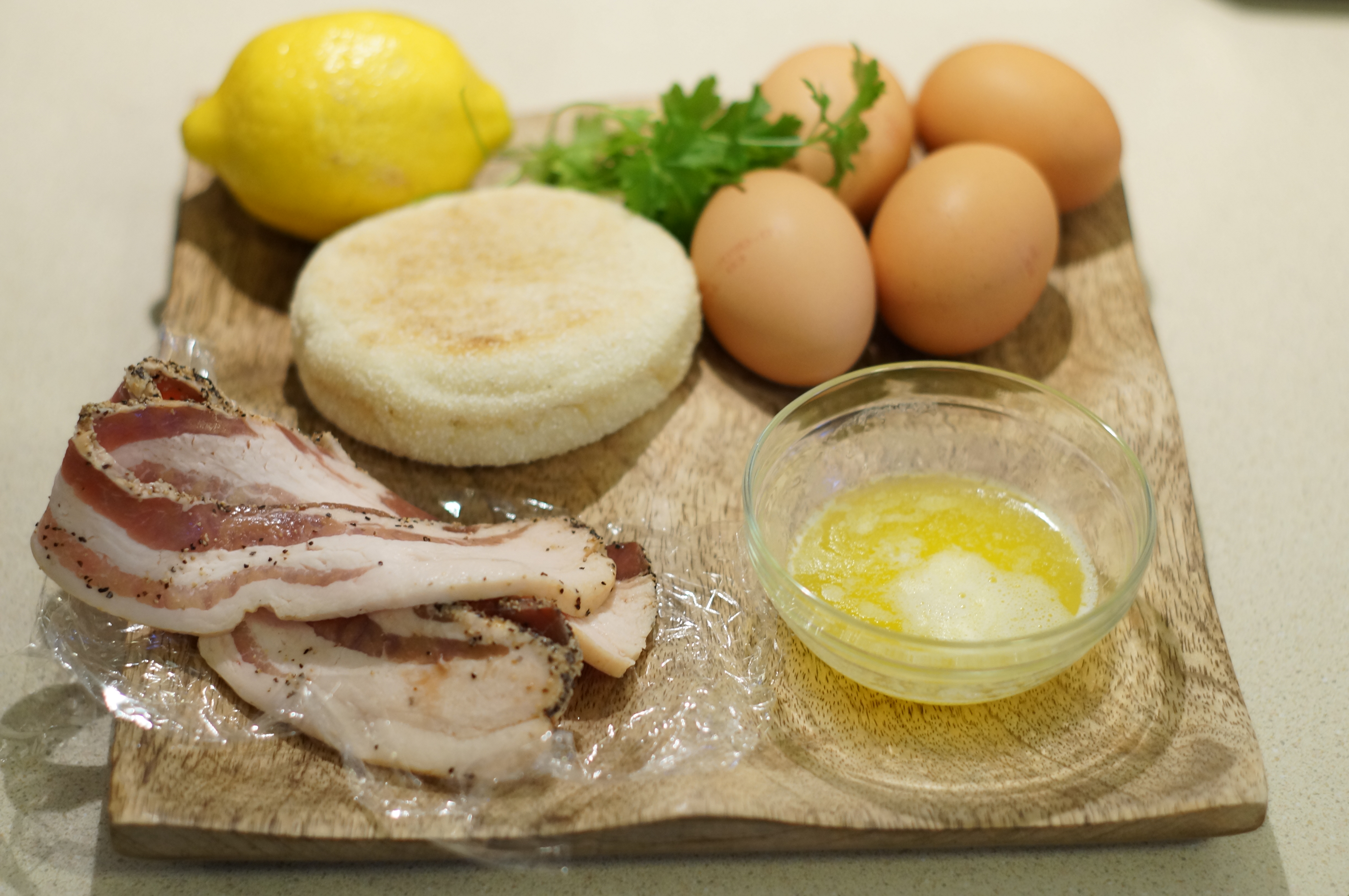 - Place English Muffins on each plate, top with one slice of bacon folding to fit on the English Muffin. Using a silicon spatula, gently remove a poached egg from the muffin tin, draining on a thick kitchen or paper towel before placing on top of bacon.