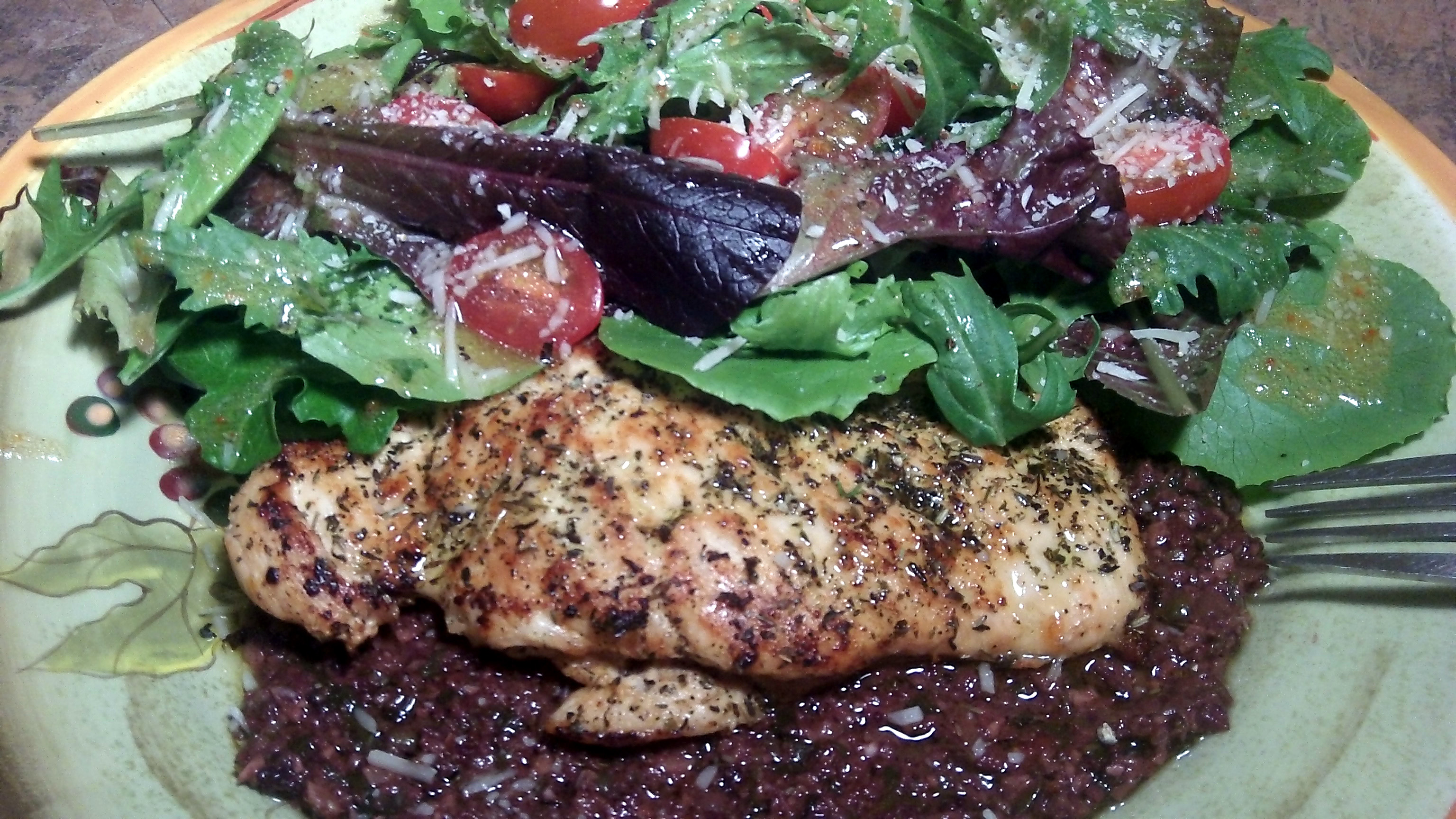 To serve lay the warm, crispy chicken paillard on a base of tapenade…1/4 cup or more per plate, top with salad. Garnish with shaved parmesan cheese, a wedge of lemon and a drizzle of olive oil.