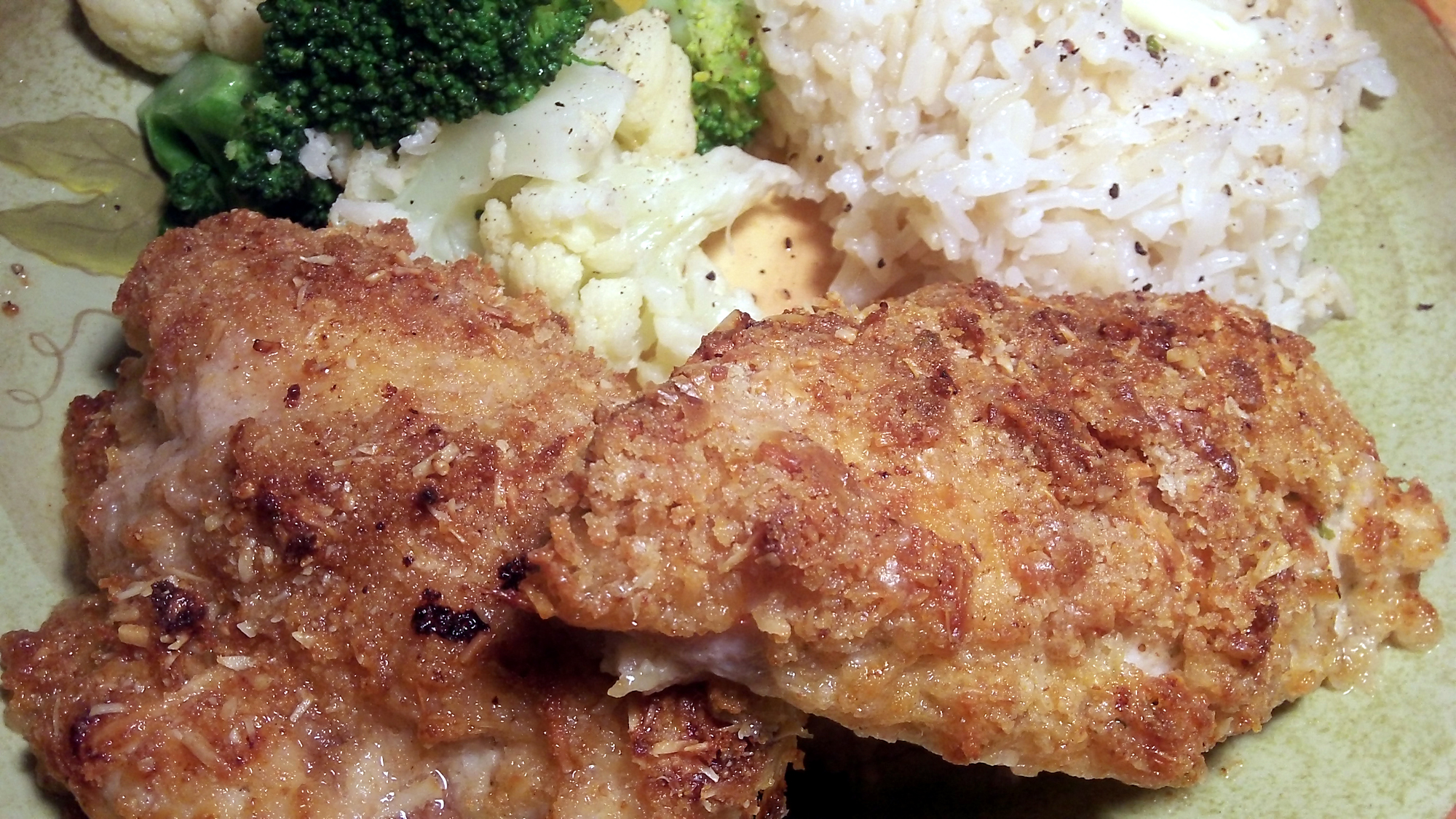 Looks delicious. The chicken reminds me of a variation of a German Schnitzel.