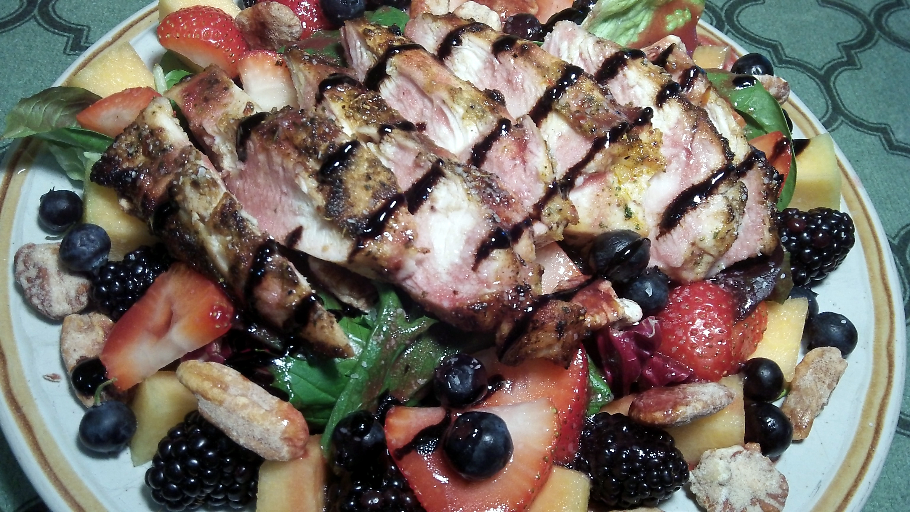 This is a superb, summertime fruit salad which satisfies all of your cravings. I use berries, predominantly, but the list of fruits are endless during the summer season. Peaches, pears and figs, just to name a few may be added or substituted. Raisins or other dried fruits can be added or substituted as well, but the sweetness and texture they provide really compliments this delectable fresh salad, so don’t forget them or the glazed nuts!